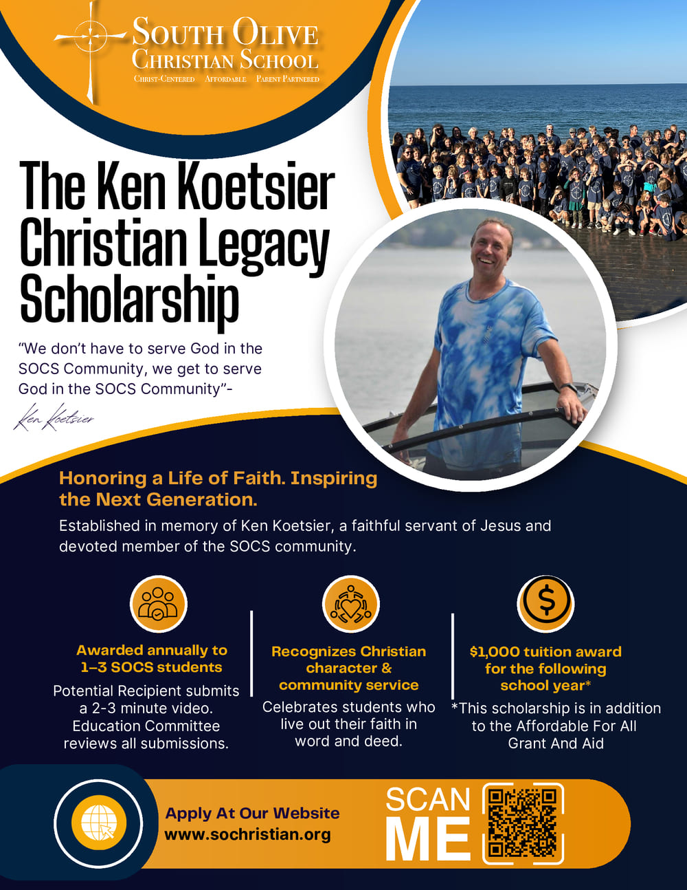 The Ken Koetsier Christian Legacy Scholarship is awarded to 1-3 South Olive Christian School Students each year who exemplify Christian Character and service in their community. This annual scholarship awards $1,000 toward the recipient’s tuition for the following school year at SOCS. Additionally, each scholarship will be matched with an additional $1,000 that will be added to the Affordable For All Tuition Fund in order to bless other students. This award goes directly to tuition and cannot be used elsewhere.